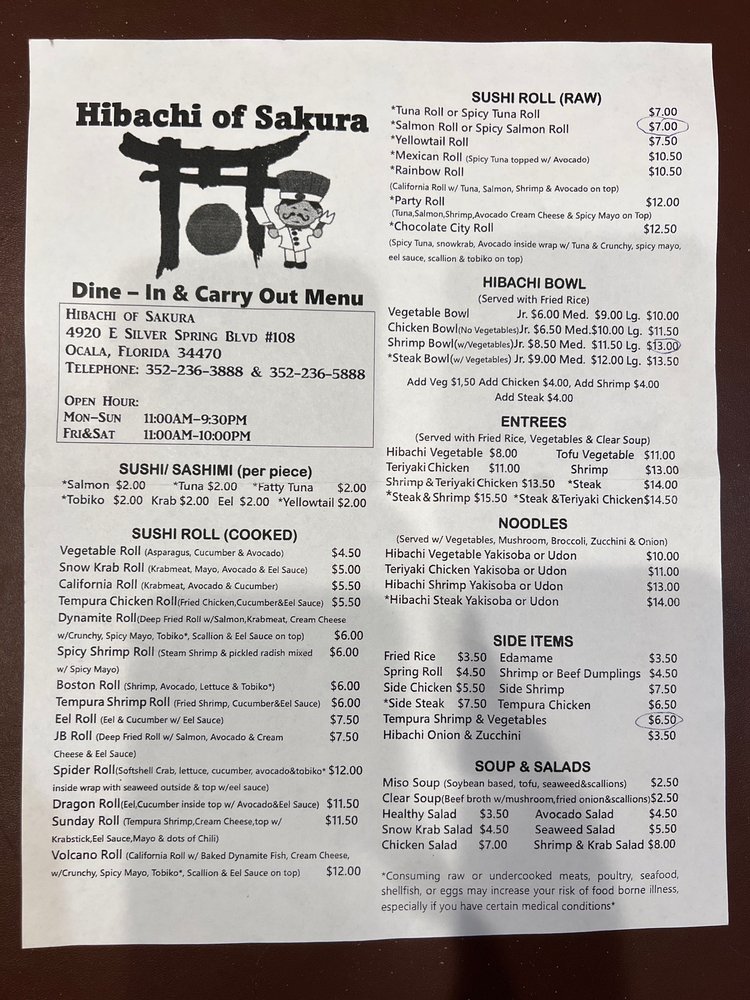 Welcome to Hibachi of Sakura, a charming gem nestled in Ocala, FL, at 4920 E Silver Springs Blvd #108. This delightful Japanese restaurant offers an authentic taste of Japan right in your neighborhood. With a warm atmosphere reminiscent of small mom-and-pop establishments, Hibachi of Sakura invites you to experience the vibrant flavors of Japanese cuisine.